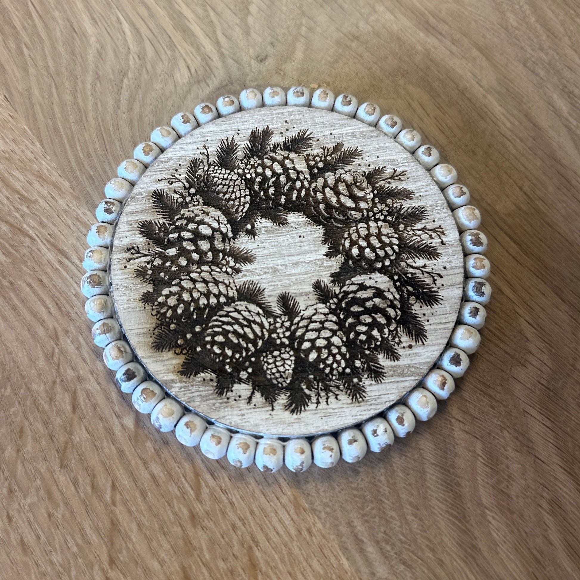 Add a charming, rustic touch to your living space with our White Rustic Beaded Coasters, measuring 3.9" in diameter. Each coaster is beautifully crafted with intricate laser-engraved Christmas designs, making them the perfect addition to your holiday décor. These festive coasters are both functional and decorative, bringing seasonal warmth to any farmhouse-style home.